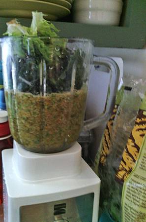 他說他就是要讓水果汁摭蓋那些青菜的味道,這樣他就可以大量吃到青菜而不覺得難吃.