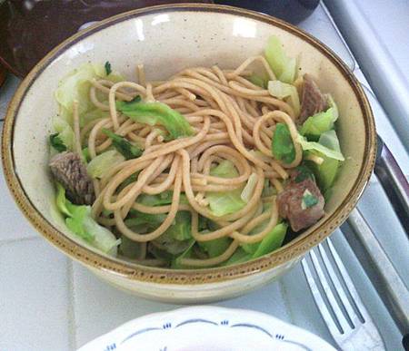 後來中餐很想吃湯麵,我想試吃意大利麵,所以選了全麥意大利麵,加一杯半的椰菜(高麗菜),加前晚吃剩的一小塊牛肉,再加8粒大蝦.