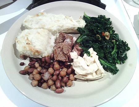 這是老公吃的晚餐份量. 我覺得澱粉類的份量給了太多 (左上是自己煮的薯蓉(馬鈴薯泥),有加牛奶,少量牛油和 cheese. 中間白色的是前幾天吃剩的水煮豆腐,約 1/3量杯的份量.