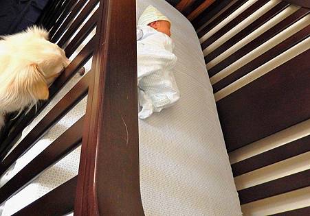 (小狗椰子第一次看到小 baby 回家,非常非常的好奇. 他現在是我的半個褓姆助手了,常隨著我跟出跟入的,每次聽到baby 的哭聲,也會第一時間跑到房間去查看baby. 而且是很認真的在注視查看,活像他也在 baby sitting.)