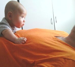 我想,平常讓他靠著我的身體在床上亂爬,真的有鼓勵作用. 不知是否巧合,才相差三四天時間而已,他已突然從不懂得移動身體而懂得自己翻身,而且還自己360度移動身體了.