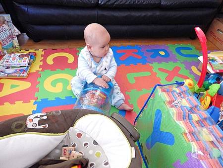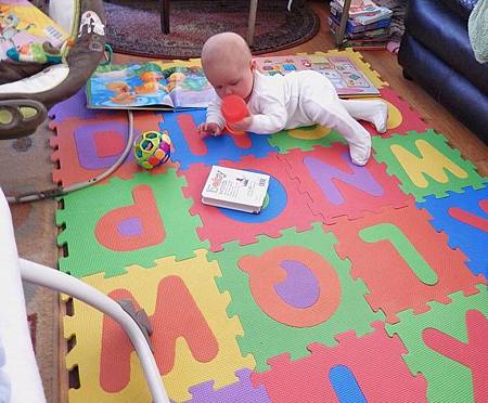 但才兩天,他自己好像慢慢摸索,現在突然越玩越起勁了. 而且雖然仍然不太愛像在香港時那麼喜歡爬,但自從在地上撥了一個空間給他玩後,他已經能漸漸控制自己的身體爬卧起坐等的連續動作了.